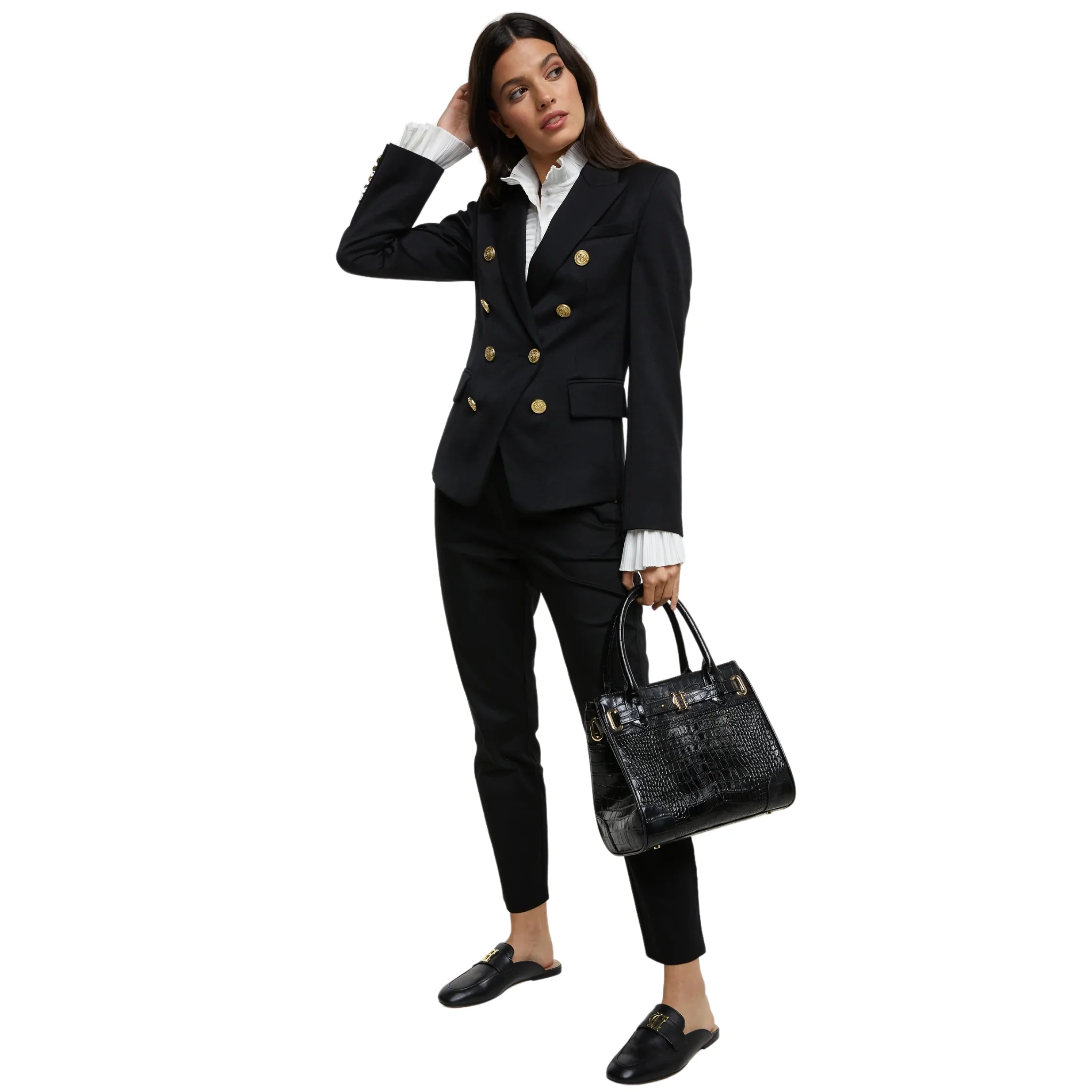 Introducing the Black Barathea Knightsbridge Blazer by Holland Cooper. Crafted from 100% wool with a luxurious satin lining, this blazer fits true to size and features a sophisticated double-breasted design. Adorned with signature Holland Cooper gold buttons on the front and cuffs, it includes two hip pockets and a flattering slim fit.