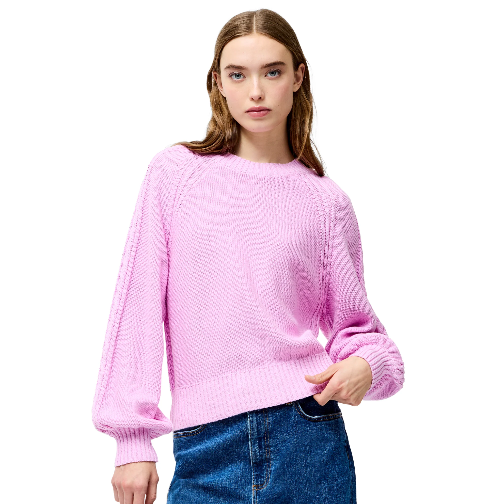 Introducing the Womens French Connection Bubblegum Pink Lily Cable Sleeve Jumper. This stylish piece features long balloon sleeves and a cable knit design, perfect for adding texture to your wardrobe. The ribbed cuffs and crew neckline add a touch of elegance to this bubblegum pink jumper. Elevate your style with this must-have statement piece.